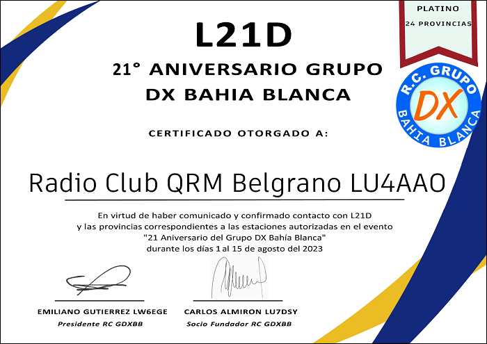 Diploma 21º Aniversario del Radio Club GDX Bahía Blanca - Toda la República Argentina.