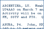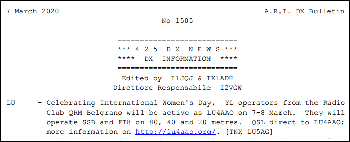 Viernes 1º de Marzo de 2019, 0 UTC a Domingo 3 de Marzo de 2019, 23:59 UTC: QSL Digital Conmemorativa 51º Aniversario de LU4AAO Radio Club QRM Belgrano. Operativo Radial Multibanda Multimodo. Los invitamos a ver más detalles en:   QSL 51 Aniversario LU4AAO.