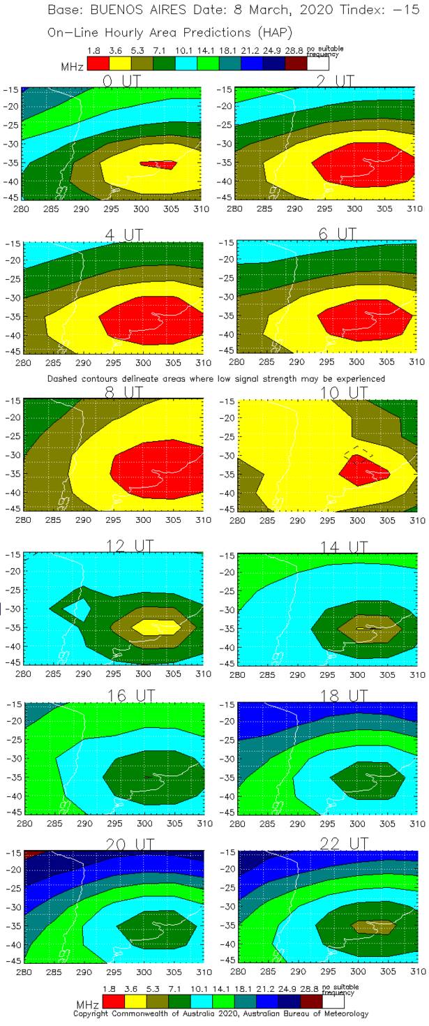 Gráfico de area de cobertura en bandas de HF, cada 2 horas, para los datos indicados en los gráficos, y con la metodología de cálculo provista por SWS/BOM Australia. |