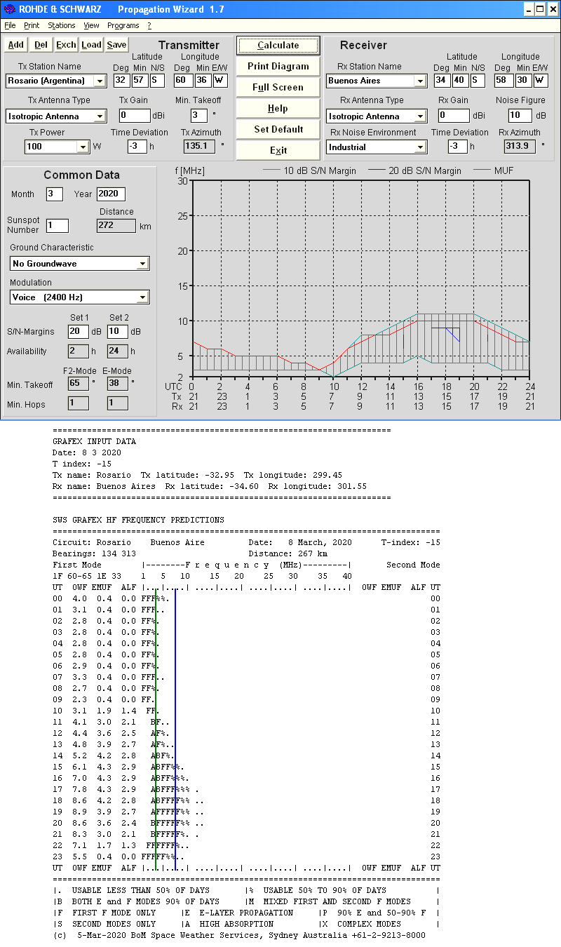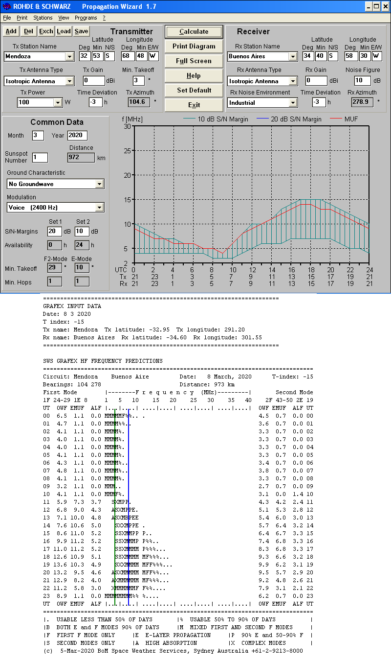 Para los valores de flujo solar (SFI), número de grupos de manchas solares (SSN) informados por NOAA e índice T informado por SWS/BOM (ex-IPS) de Australia el 8 de Marzo de 2020, se prepararon estos gráficos para enlace Mendoza - Buenos Aires, representativo de un enlace en HF de un solo salto inosférico por capa F y longitud media, con Rohde & Schwarz PropWiz y con SWS/Grafex. |