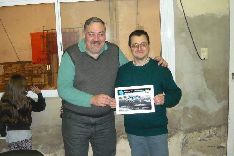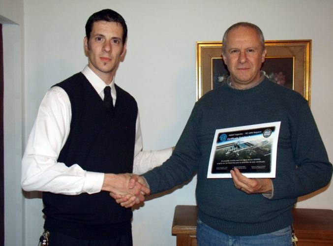 Juan Carlos, LU4AGC; Mario, LU4BMG y Raul, LU5AG, recibiendo el Certificado Permanente Amsat a Contactos (C5C). |