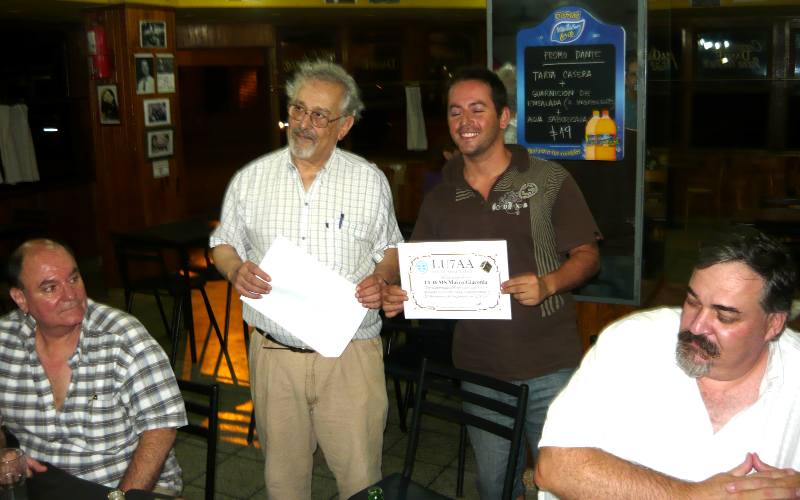Entrega de Certificados a quienes operaron como estaciones colaboradoras. Pedro, LU7ABF, en representación de Amsat Argentina, LU7AA, hace entrega de un Certificado especial recordatorio a Marco, LU4EMS. (51 KB) |